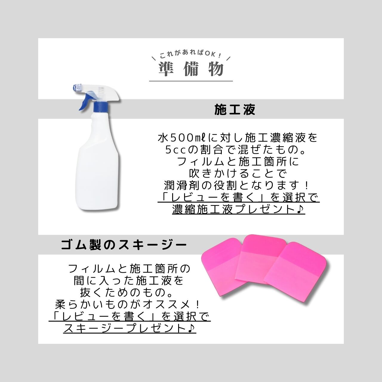 ①商品購入時に「レビューを書いて施工液